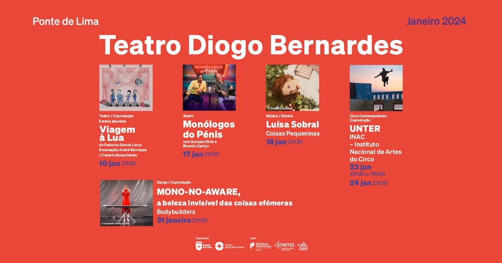 Em janeiro, o Município de Ponte de Lima continuará a apostar na programação cultural do Teatro Diogo Bernardes, com uma oferta diferenciada de espetáculos nos mais distintos segmentos culturais, com especial destaque para as coproduções "Viagem à Lua" de Federico Garcia Lorca, com encenação de André Murraças, pela Canário Bonacheirão, no dia 10, pelas 21h30; "UNTER", pelo INAC - Instituto Nacional de Artes do Circo, no dia 23, com duas sessões para público escolar, pelas 10h30 e 15h00 e dia 24, pelas 21h30; e, "MONO-NO-AWARE", a beleza invisível das coisas efémeras, por Bodybuilders, no dia 31, pelas 21h30.