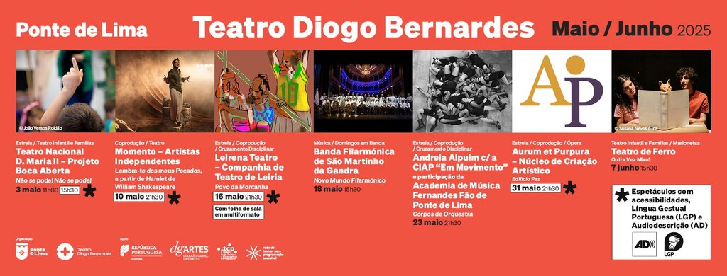 Na área do Teatro, destaque para a coprodução, “LEMBRA-TE DOS MEUS PECADOS” a partir de Hamlet de William Shakespeare, pela Momento – Artistas Independentes, no dia 9 de maio, pelas 10.00 horas, com uma sessão exclusiva para público escolar e no dia 10 de maio, pelas 21.30 horas, uma sessão para público geral. Trata-se de um espetáculo onde este texto icónico transforma-se no centro de uma competição inesperada: um talent show em que jovens atores profissionais e pessoas idosas sem experiência teatral tentarão alcançar a sua melhor versão do monólogo. Realçamos ainda a coprodução, “O POVO DA MONTANHA”, pela Leirena Teatro – Companhia de Teatro de Leiria, em Estreia Absoluta no Teatro Diogo Bernardes, no dia 16 de maio, pelas 21.30 horas, com uma sessão exclusiva para público geral. O espetáculo pretende explorar a luta pela sobrevivência do povo Ik, caçadores-coletores das montanhas de Uganda, que foram forçados a deixar suas terras ancestrais. A partir do livro de Colin Turnbull e inspirado em uma montagem encenada por Peter Brook, o espetáculo combina teatro, música e circo, abordando temas de pertença, identidade e resistência cultural. Estes espetáculos integram a Rede de Teatros com Programação Acessível (RTPA), tendo interpretação em Língua Gestual Portuguesa e Audiodescrição, nas sessões para público geral.