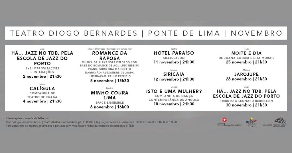 Ainda durante o mês de novembro, integrado na sua programação, será possível assistir a um conjunto de espetáculos na área do Teatro, nomeadamente, no dia 4 de novembro, pelas 21h30, Calígula de Albert Camus, com encenação de Manuel Guede de Oliva, pela Companhia de Teatro de Braga; no dia 11 de novembro, pelas 21h30, os SillySeason, estrutura artística que pela primeira vez atua no Teatro Diogo Bernardes, apresentam Hotel Paraíso, um espetáculo que tem a ilha como inspiração para um mundo futuro “distópico” e corrosivo; e no dia 25 de novembro, pelas 21h30 será apresentada a peça de teatro Noite e Dia de Joana Cotrim e Rita Morais, em que a ação do espetáculo acontece após uma catástrofe, a cidade está inundada…