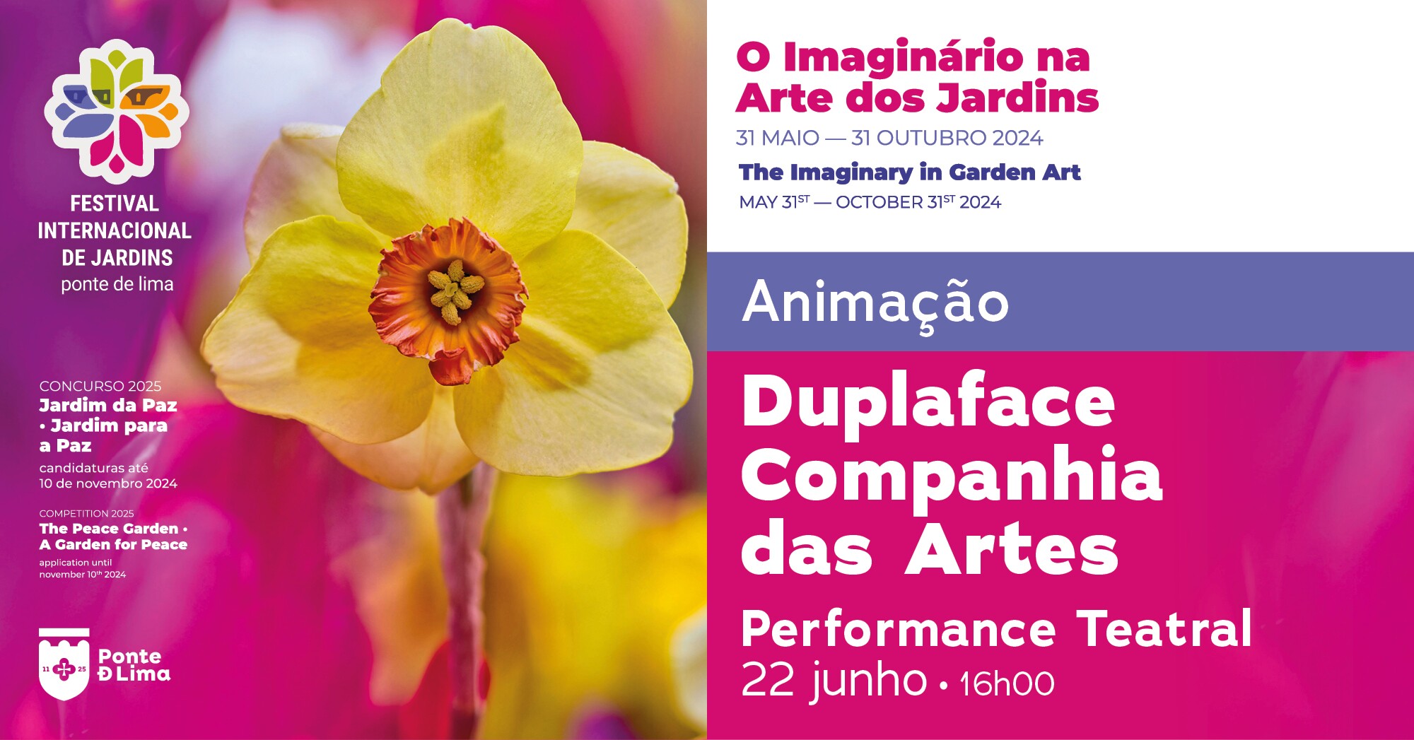 O Município de Ponte de Lima, no âmbito do Festival Internacional de Jardins, promove um conjunto de momentos de animação, pelo DUPLAFACE - Companhia das Artes.