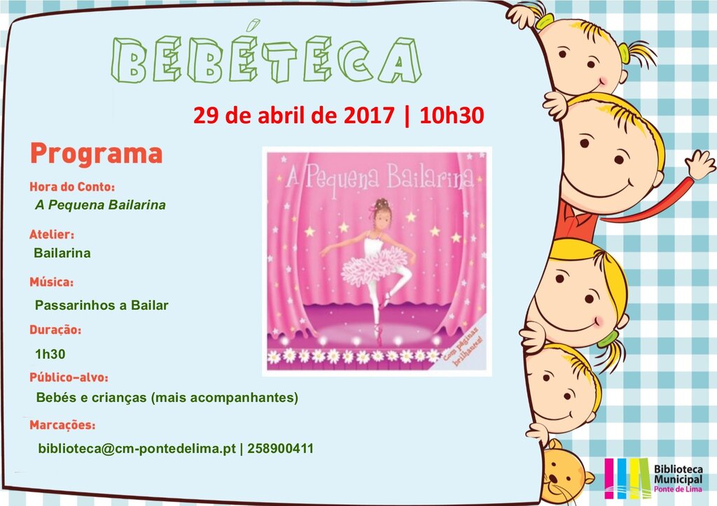 No próximo dia 29 de abril de 2017 a Biblioteca Municipal de Ponte de Lima dinamiza mais uma sessão da Bebéteca para bebés, crianças e suas famílias.
