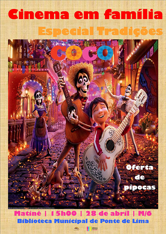 A próxima edição do Cinema em Família, agendada para 28 de abril, pelas 15h00, na Biblioteca Municipal de Ponte de Lima (BMPL), vai apresentar um dos grandes sucessos da Disney Pixar – “Coco” – longa-metragem distinguida na 90.ª cerimónia de entrega dos Óscares nas categorias de “Melhor Filme de Animação” e de “Melhor Canção Original”. Uma oportunidade para acompanhar a história de Miguel - um menino mexicano de 12 anos que ambiciona tornar-se um guitarrista famoso - e para conhecer as tradições inerentes à celebração do Dia dos Mortos – cerimónia de origem indígena declarada Património Cultural Imaterial da Humanidade pela UNESCO.1