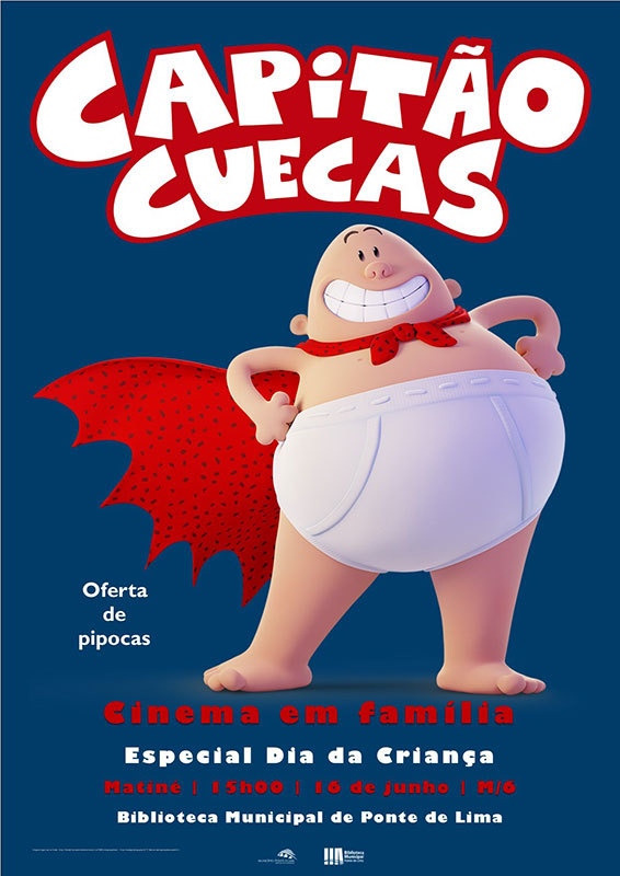 A divertida comédia de animação da DreamWorks Animation – “Capitão Cuecas” – é a sugestão da próxima edição do Cinema em Família agendada para o dia 16 de junho, sábado, pelas 15h00, na Biblioteca Municipal de Ponte de Lima. Uma oportunidade para acompanhar as aventuras de George e Harold, inseparáveis amigos e criadores de originais histórias de banda desenhada que, na tentativa de escaparem à perseguição do inflexível diretor da escola, o Sr. Krupp, acabam por acidentalmente hipnotizá-lo e transformá-lo no Capitão Cuecas – um improvável super-herói cuja indumentária consiste numas grandes cuecas brancas e num pedaço de cortina vermelha como capa.