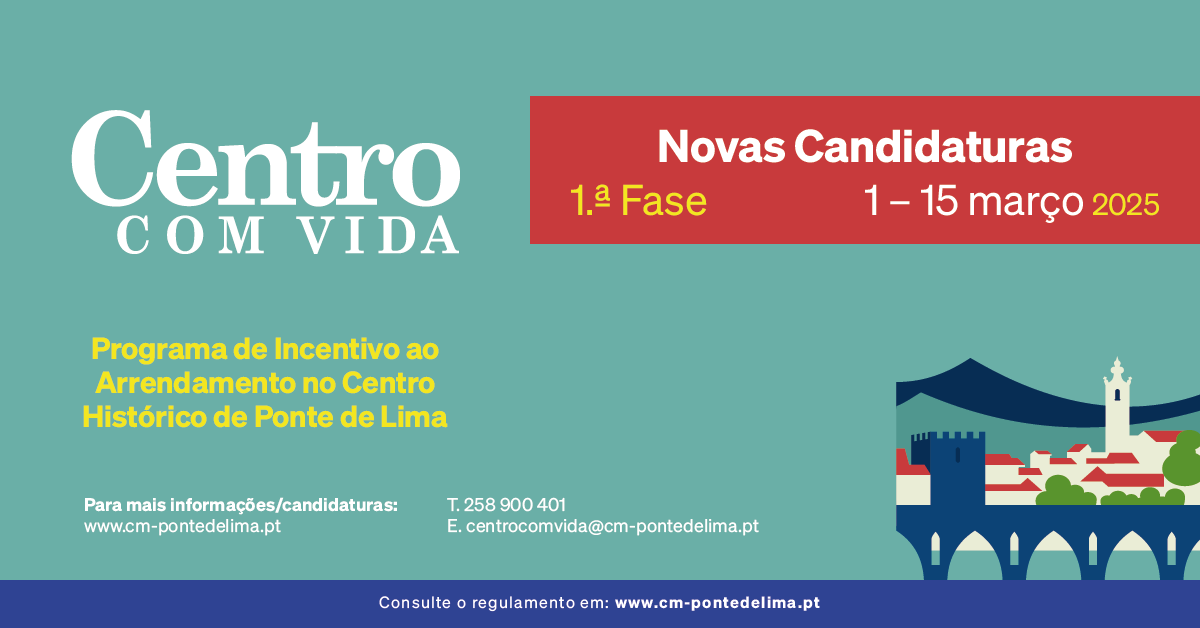 De 1 a 15 de março do corrente ano, está aberto o período de candidaturas à 1ª fase do programa Centro Com Vida, iniciativa do Município de Ponte de Lima que visa incentivar o arrendamento no Centro Histórico.