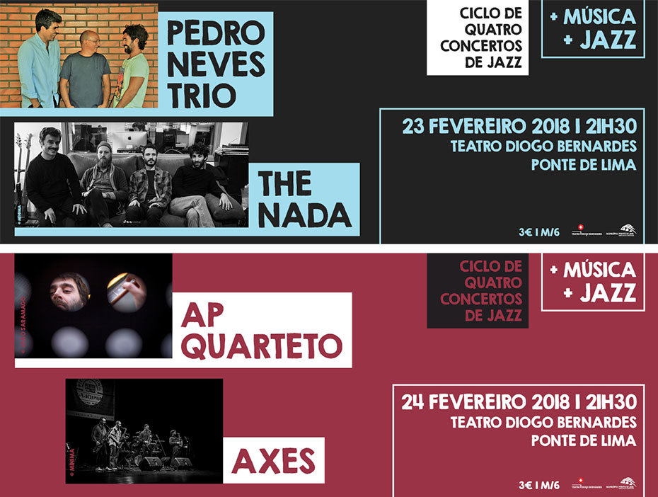 - Ciclo de Quatro Concertos de Jazz – Uma Maratona do Melhor Jazz Nacional no Teatro Diogo Bernardes | 23 de Fevereiro – 21h30 – Pedro Neves Trio + The Nada | 24 de Fevereiro – 21h30 – AP Quarteto + Axes
