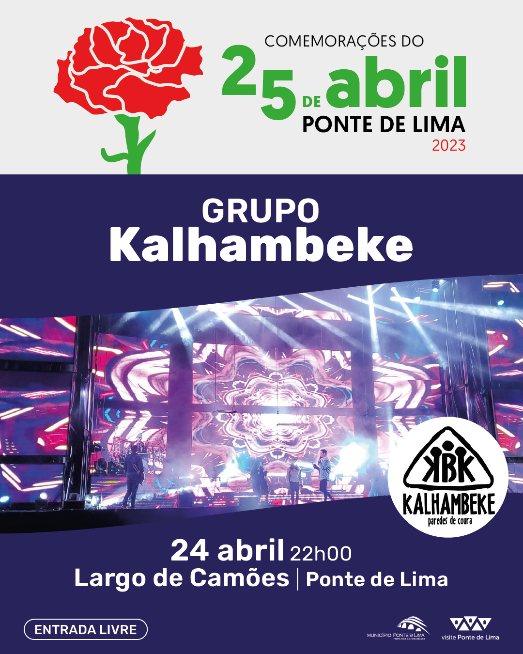 Inserido nas comemorações do 25 de abril, Ponte de Lima recebe hoje dia 24 de abril, no Largo de Camões, pelas 22 horas, o espetáculo musical/baile pelo Grupo Kalhambeke, que proporcionará aos limianos e público em geral, que habitualmente visitam esta vila, um espetáculo cheio de alegria, cor e dinamismo.