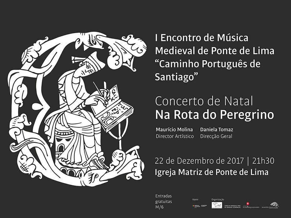 Na sequência da residência artística que está a decorrer em Ponte de Lima, denominada I Encontro de Música Medieval de Ponte de Lima, será apresentado o Concerto de Natal “Na Rota do Peregrino”, com Direcção Artística de Maurício Molina e Direcção Geral de Daniela Tomaz e com a participação de Carlos Meireles, Lucía Martín-Maestro Verbo, Yenisey Gomez – Canto, Isabella Shaw – Canto e Harpa Medieval, Ana Villamayor – Harpa Medieval, Maria de Mingo Carranza – Cítola Medieval, Jakub Michl – Fídula Medieval, Carme Juncadella – Organetto, Daniela Tomaz – Flautas e Percussão Medieval e Josafat Larios – Percussão Medieval.