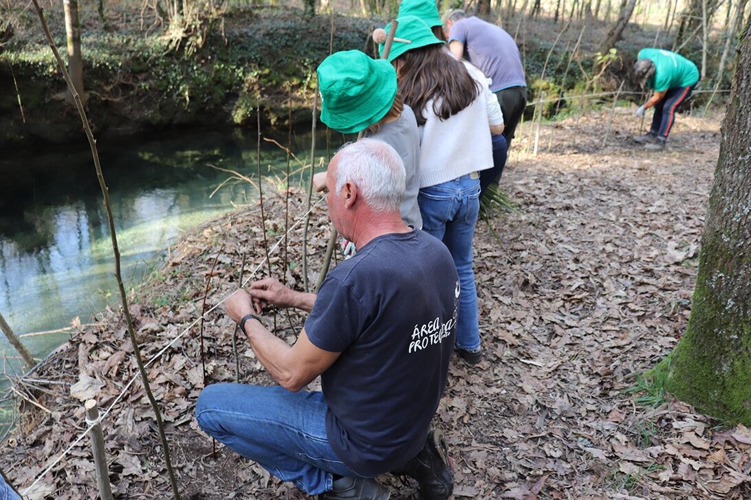 Durante a tarde, a ação concentrou-se na principal linha de água da Área Protegida, o rio Estorãos, onde realizaram uma ação de restauro da margem, no sentido de Renaturalizar a galeria ripícola, criando uma sebe natural com estacaria de salgueiro.