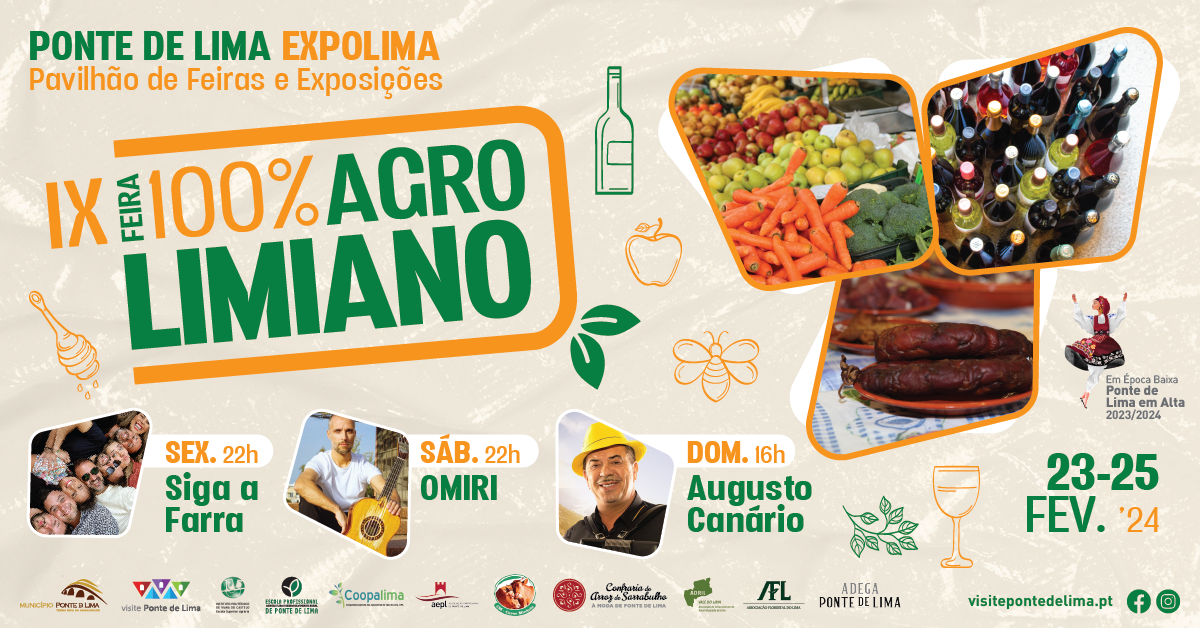 A IX Feira 100% Agrolimiano volta à Expolima, nos dias 23, 24 e 25 de fevereiro, promovendo o que de melhor se produz no setor agroalimentar de Ponte de Lima.