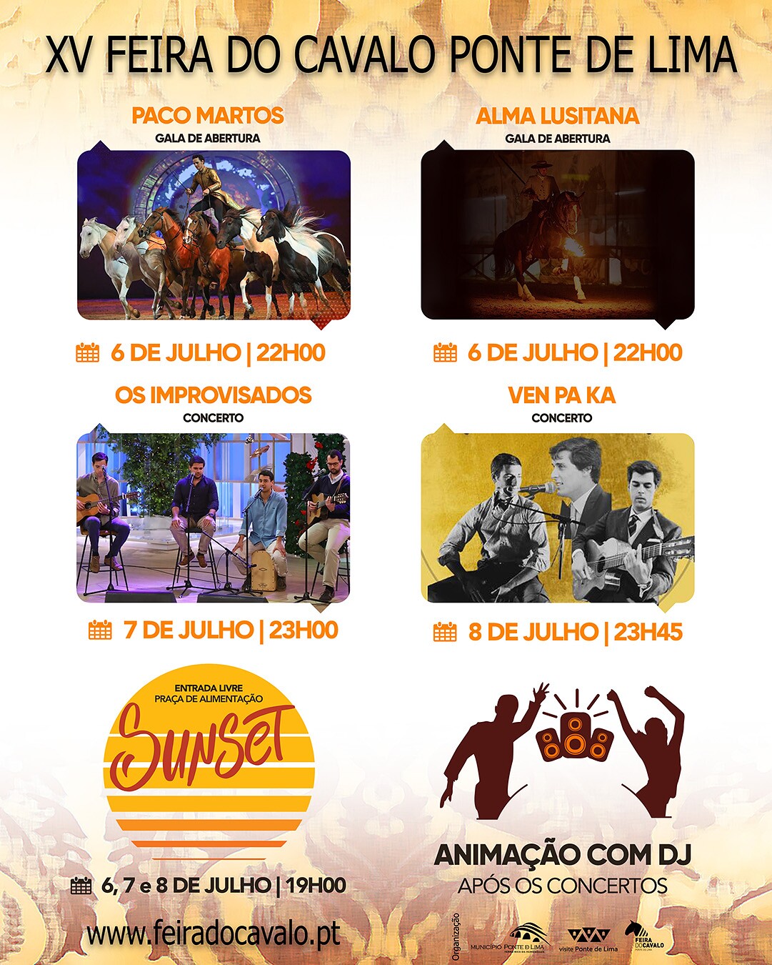 A tradicional gala de abertura, a 6 de julho às 22 horas contará com o espetáculo de Paco Martos, acompanhado dos seus cavalos em liberdade e Alma Lusitana. Neste mesmo dia haverá uma festa Sunset, às 19 horas, com DJ Jacinto M. – na praça de alimentação, e animação musical com DJ Bruno Rodrigues e DJ Manoff após a gala de abertura.