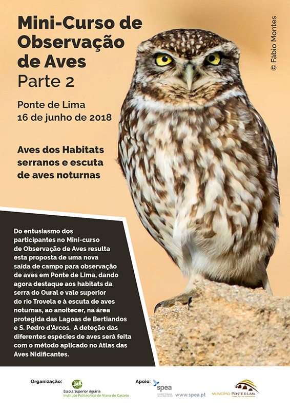 Esta sessão prática do curso é dinamizada por ornitólogo credenciado (Eng. Miguel Cardoso), com organização da ESA-IPVC e com os apoios do Município de Ponte de Lima e da Sociedade Portuguesa de Estudos das Aves (SPEA).