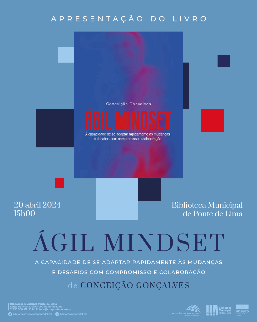 O Município de Ponte de Lima vai promover a apresentação do livro "Ágil Mindset - a capacidade de se adaptar rapidamente às mudanças e desafios com compromisso e colaboração", da autoria de Conceição Gonçalves, no dia 20 de abril, às 15h00, na Biblioteca Municipal.