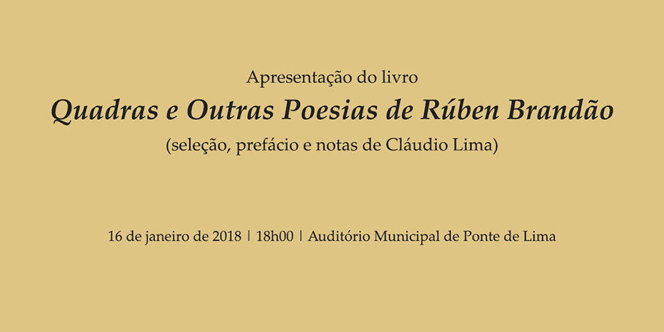 - Município de Ponte de Lima apresenta “Quadras e Outras Poesias” de Rúben Brandão - 16 de janeiro, 18 horas | Auditório Municipal