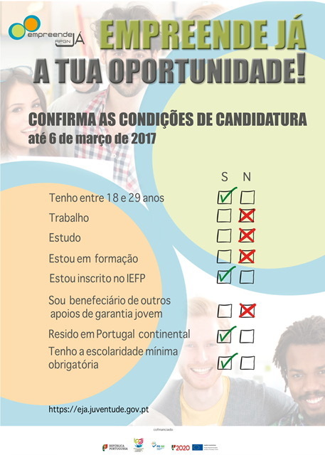O Programa Empreende Já, destina-se a jovens com idades compreendidas entre os 18 e os 29 anos de idade, que não se encontrem inseridos no mercado de trabalho, que não estejam a estudar e que não estejam a frequentar qualquer ação de formação (NEET); Estejam inscritos/as no IEFP (Instituto de Emprego e Formação Profissional, I.P).