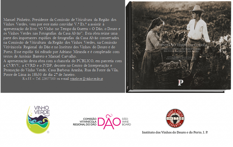 - “O Vinho no Tempo da Guerra – O Dão, o Douro e os Vinhos Verdes nas Fotografias da Casa Alvão” – Apresentação no CIPVV – Centro de Interpretação e Promoção do Vinho Verde – Ponte de Lima | 27 de janeiro – 18h30