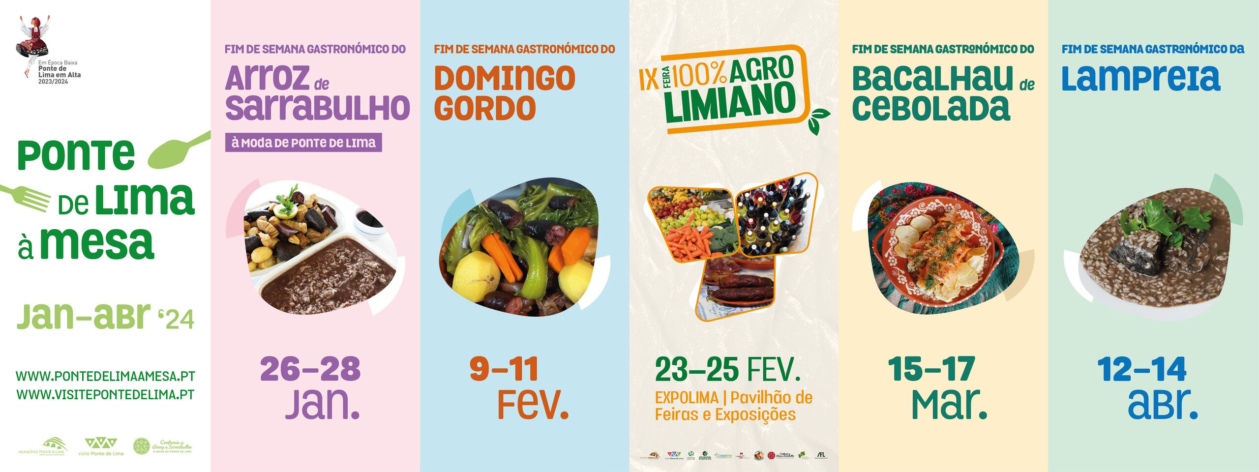 Entre os cinco eventos abarcados neste projeto, arranca de 26 a 28 de janeiro o primeiro, o Fim de Semana Gastronómico do Arroz de Sarrabulho à Moda de Ponte de Lima que se foca no mais reconhecido prato limiano. Em seguida, o Fim de Semana Gastronómico do Domingo Gordo ocorre de 9 a 11 de fevereiro onde se celebram pratos recheados como o Cozido à Portuguesa. A Feira 100% Limiano, empenhada em preservar e divulgar o setor agroalimentar de Ponte de Lima ocorre de 23 a 25 de fevereiro no Pavilhão de Feiras e Exposições. Em março, entre os dias 15 e 17 realiza-se o Fim de Semana Gastronómico do Bacalhau de Cebolada. Finalmente, de 12 a 14 de abril, chega a vez de outro prato típico limiano com o Fim de Semana Gastronómico da Lampreia.