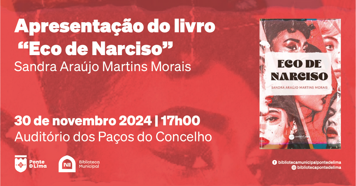 O Município de Ponte de Lima vai promover a sessão de apresentação do livro "Eco de Narciso", da autoria de Sandra Araújo Martins Morais, dia 30 de novembro, pelas 17h00, no auditório dos Paços do Concelho.