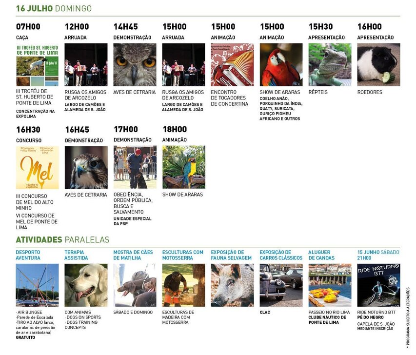 O programa matiza-se pela Academia de Música Fernandes Fão em concerto, pelos concursos de mel de Ponte de Lima, e do Alto Minho, pelo concurso de “Beldades Caninas”, por atividades promovidas pelo Exército, por um Free Trail, por um desfile de carros clássicos, por atividades paralelas à Feira, desde Air Bungee a Tiro ao Alvo, assim como por diversas demonstrações e arruadas.