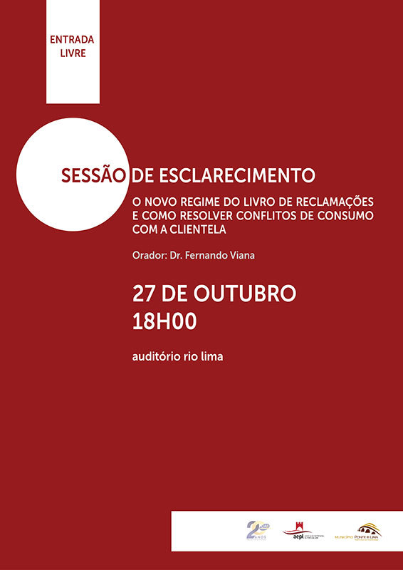 A Associação Empresarial de Ponte de Lima em colaboração com o Município de Ponte de Lima e o CIAB - Tribunal Arbitral de Consumo, irá promover, no próximo dia 27 de outubro, sexta-feira, pelas 18h00, no Auditório Rio Lima, uma Sessão de Esclarecimento destinada a todos os empresários e público em geral subordinado ao tema "O novo regime do livro de reclamações e como resolver conflitos de consumo com a clientela".