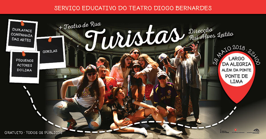 A 26 de maio, sábado, no Largo da Alegria (Além da Ponte), será apresentado o exercício final da formação/curso de longa duração do Serviço Educativo do Teatro Diogo Bernardes 2017-2018, dirigido aos actores dos grupos de teatro do concelho, com o título Turistas.