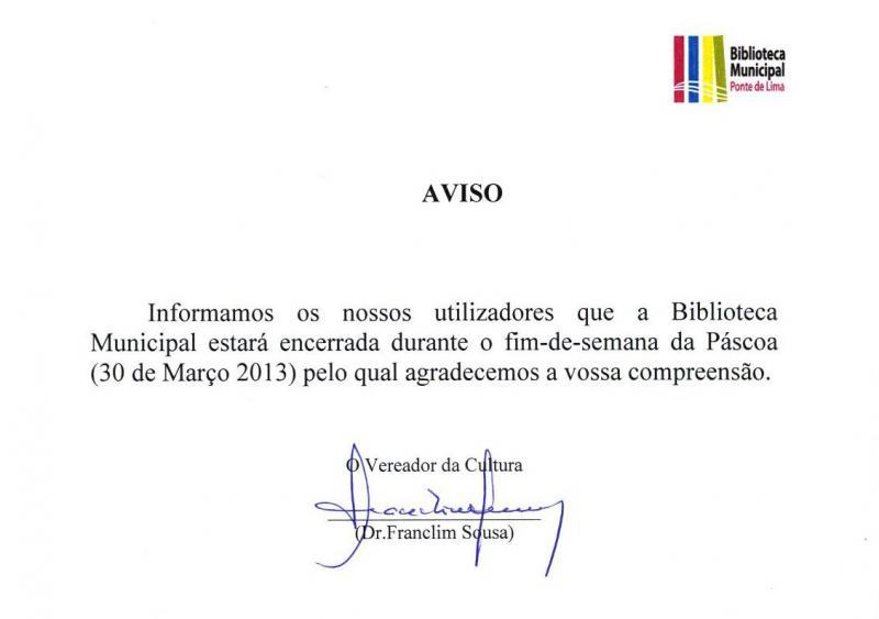 Informamos os nossos utilizadores que a Biblioteca Municipal estará encerrada durante o fim-de-semana da Páscoa (30 de março 2013), pelo qual agradecemos a vossa compreensão.