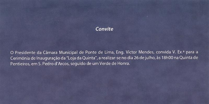 A inauguração oficial da "Loja da Quinta" está agendada para o dia 26 de julho, às 18 horas. "A Loja da Quinta" localizada na Quinta de Pentieiros, em S. Pedro de Arcos será um espaço de promoção e exposição dos produtos locais, desde o artesanato...