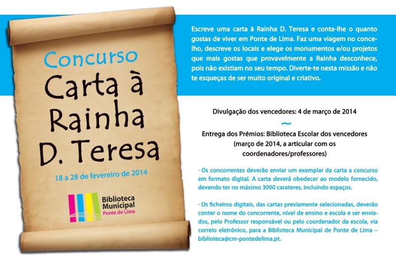 O Concurso Carta à Rainha D. Teresa visa estimular o gosto pela escrita criativa e consolidar hábitos de leitura. Os participantes têm de escrever uma carta à Rainha D. Teresa enaltecendo o amor que sentem por Ponte de Lima. Fazendo uma viagem no concelho de Ponte de Lima, os alunos podem escrever os locais e eleger os monumentos ou projetos que mais gostam. O prazo para a entrega dos trabalhos termina a 1 de março. A divulgação dos vencedores está agendada para o dia 5 de março.