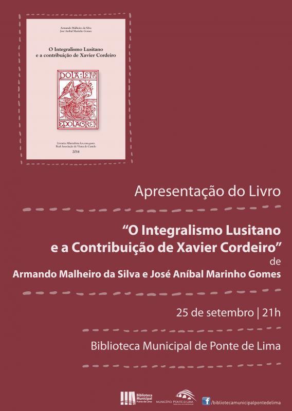 A Biblioteca Municipal de Ponte de Lima vai promover a apresentação do livro O Integralismo Lusitano e a contribuição de Xavier Cordeiro, no dia 25 de setembro, às 21h, no auditório da Biblioteca Municipal de Ponte de Lima.