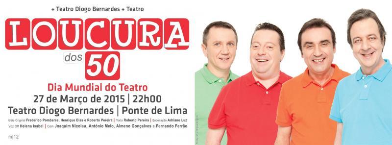 Na próxima sexta-feira, 27 de Março, às 22h00, nas comemorações do Dia Mundial do Teatro, o Teatro Diogo Bernardes em Ponte de Lima apresenta "Loucura dos 50", uma comédia com Joaquim Nicolau, António Melo, Almeno Gonçalves, Fernando Ferrão e Helena Isabel em voz off, com versão cénica e encenação de Adriano Luz, espectáculo que se encontra com lotação esgotada há cerca de duas semanas.