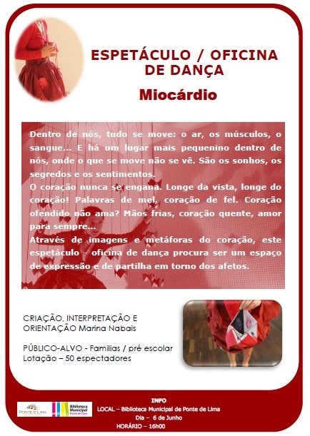 A Biblioteca Municipal de Ponte de Lima, recebe no próximo sábado, dia 6 de junho, às 16 horas, o espetáculo/oficina de dança intitulado "Miocárdio", produzido pelas Comédias do Minho.