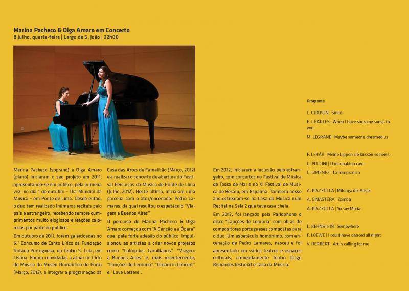 A noite de hoje apresenta-nos Marina Pacheco & Olga Amaro em Concerto, no Largo de S. João, a partir das 22h00, naquele que se espera venha ser mais um momento marcante em termos musicais.
