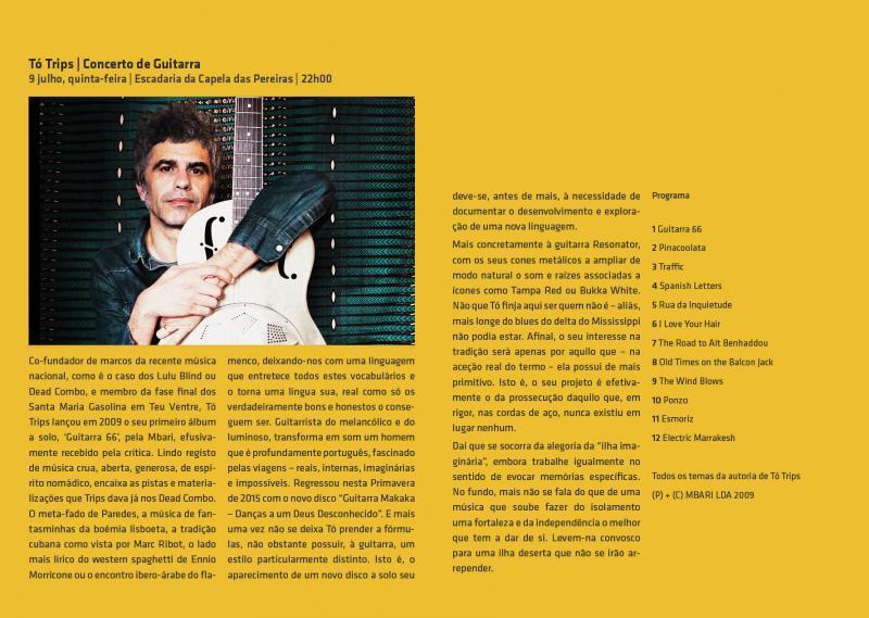 Para quinta-feira, dia 9 de Julho, também às 22h00, desta vez na Escadaria da Capela das Pereiras, o Festival Percursos da Música apresenta Tó Trips, guitarristas da banda portuguesa Dead Combo, que se apresentará a solo para apresentar o seu mais recente trabalho: "Guitarra Makaka - Danças a um Deus Desconhecido".