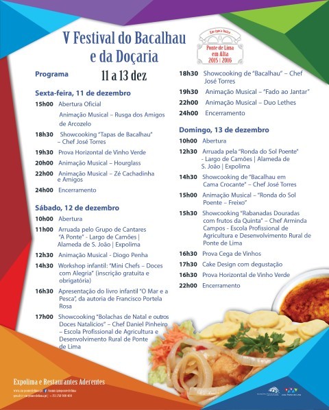 Showcookings, workshop Infantil "Mini Chefs - Doces com Alegria", provas de vinho verde e a apresentação do livro infantil "O Mar e a Pesca", da autoria de Francisco Portela Rosa, são algumas das muitas iniciativas que convidam a passar um dia com a família e amigos, em Ponte de Lima, no V Festival do Bacalhau e da Doçaria.
