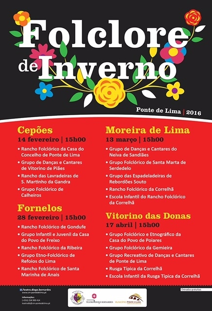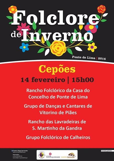 No próximo Domingo, 14 de Fevereiro, às 15h00, em Cepões - Ponte de Lima, será realizado o primeiro de quatro festivais de folclore em freguesias do concelho limiano, com entradas gratuitas, sob a designação genérica de Folclore de Inverno, dando continuidade à política de descentralização cultural que o Município de Ponte de Lima tem desenvolvido, adicionando o folclore às bandas filarmónicas, ao teatro e a outras áreas artísticas que serão divulgadas oportunamente.