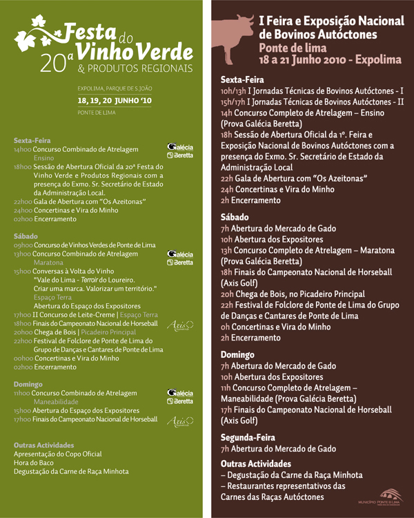 Numa organização conjunta entre o Município, E e a de Ponte de Lima, a edição 2010 da Festa do Vinho Verde promove a e as .