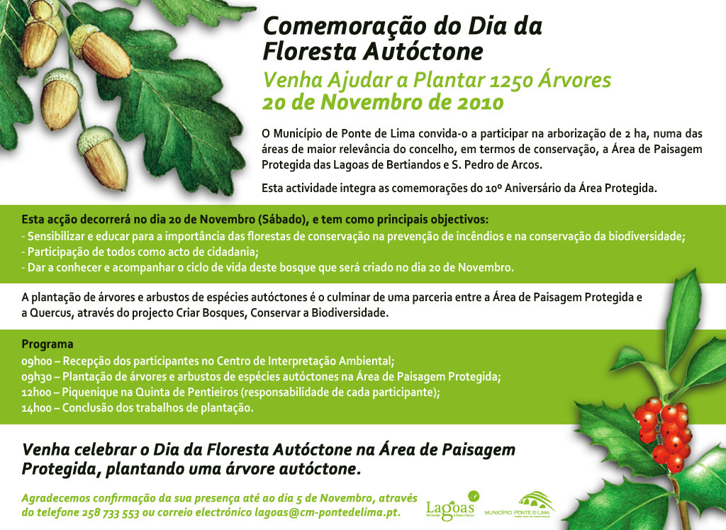 A par da campanha de sensibilização e conservação das florestas, estas comemorações do Dia da Floresta Autóctone integram o programa do 10º Aniversário da Área de Paisagem Protegida das Lagoas de Bertiandos e S. Pedro de Arcos, celebrado a 11 de dezembro de 2010.