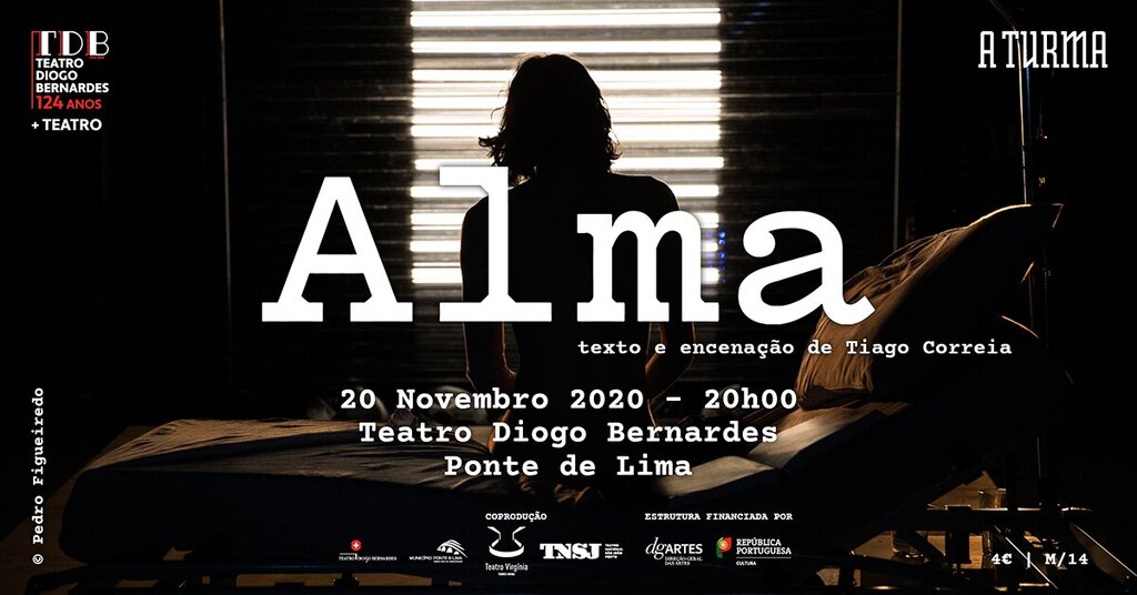 No dia 20 de novembro, sexta-feira, às 20h00, horário que permite respeitar o recolher obrigatório, o Teatro Diogo Bernardes, em Ponte de Lima, apresenta o espetáculo de teatro Alma, pela A Turma, com texto e encenação de Tiago Correia, dando continuidade à programação anunciada e a que o público tem aderido de forma bastante satisfatória, pois sabem que a Cultura é Segura e as salas de espetáculos cumprem à risca as normas e orientações da Direção-Geral da Saúde para a prevenção da Covid-19.