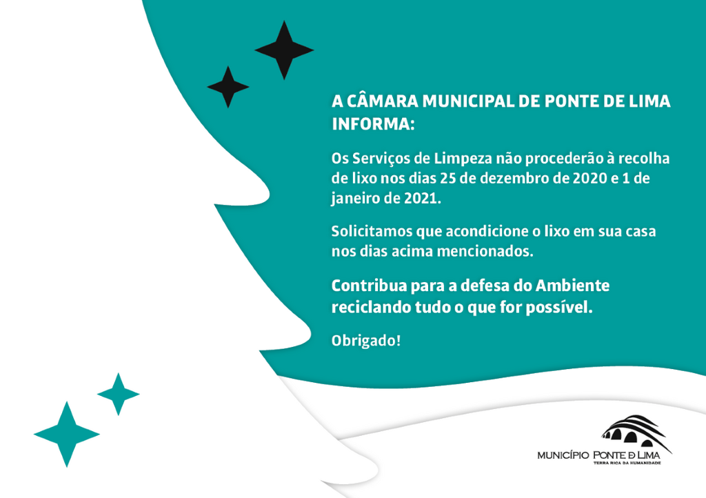 Os Serviços de Limpeza não procederão à recolha de lixo nos dias 25 de dezembro de 2020 e 1 de janeiro de 2021.