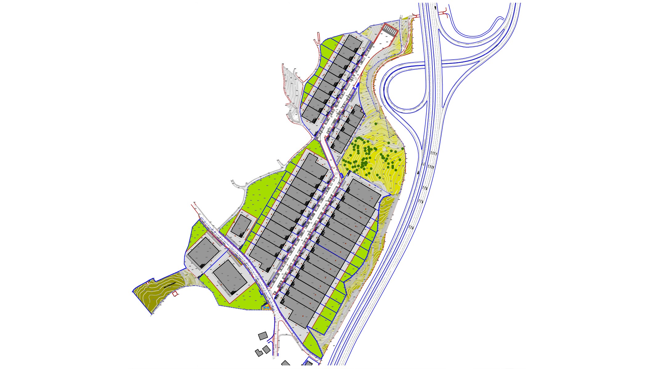 O trânsito e acesso aos vários lotes é feito por um arruamento central que deriva da rua de Couto de Calvelo, que desemboca numa área de impasse que serve de estacionamento de veículos pesados, e que dispões da área necessária para efeitos da inversão do sentido de circulação. Esta configuração poderá permitir uma continuidade do acesso numa eventual futura expansão do loteamento para Norte.