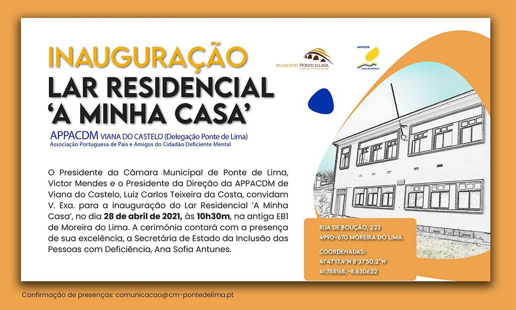 A Secretária de Estado da Inclusão Social das Pessoas com Deficiência, Ana Sofia Antunes, preside à cerimónia oficial de inauguração do lar Residencial para Pessoas com Deficiência Mental “A Minha Casa” da Associação Portuguesa de Pais e Amigos do Cidadão Deficiente Mental e Viana do Castelo APPACDM – Delegação de Ponte de Lima, instalado na antiga escola primária de Moreira do Lima.