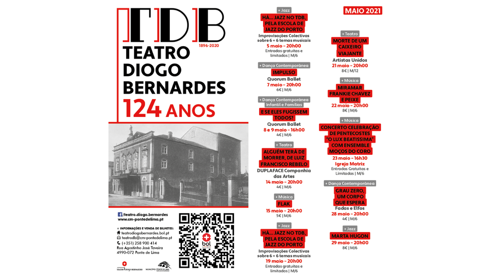 Considerando que os horários da restauração e das salas de espetáculos têm sido sempre semelhantes, e dado que a partir do dia 3 de maio, os restaurantes, cafés e pastelarias passam a funcionar sem limites de horário, o Teatro Diogo Bernardes de Ponte de Lima apresenta toda a sua programação entre os dias 5 e 29 de maio: em horário noturno, às 20h00 nos dias 5, 7, 14, 15, 19, 21, 22, 28 e 29 de maio; em horário de matiné nos dias 8 e 9 de maio às 16h00, e no dia 23, um concerto na Igreja Matriz de Ponte de Lima, às 16h30.