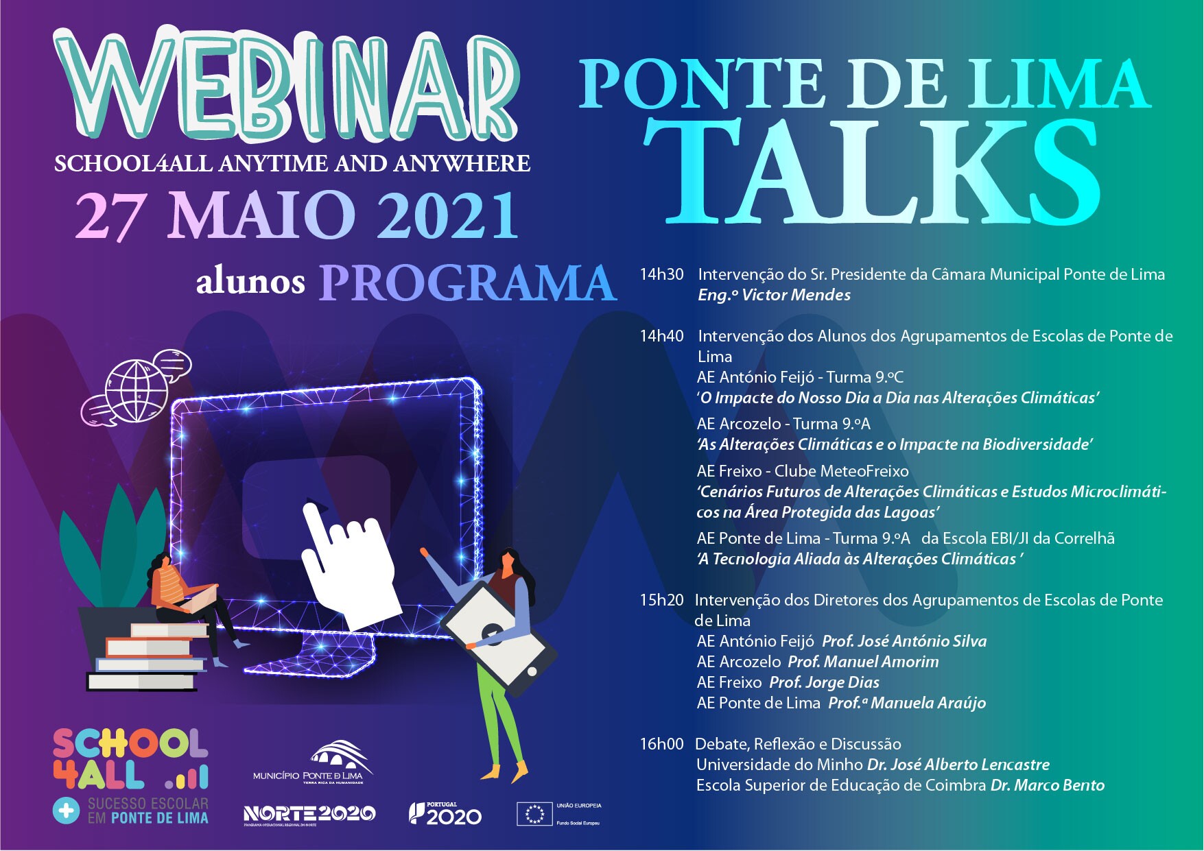 Pretende-se, com o “Ponte de Lima Talks 2021”, proporcionar um momento de partilha de informação e de experiências, entre os quatro Agrupamentos de Escolas de Ponte de Lima, no que se refere à candidatura School4All - Espaços de Aprendizagem Personalizada - Ação 2.