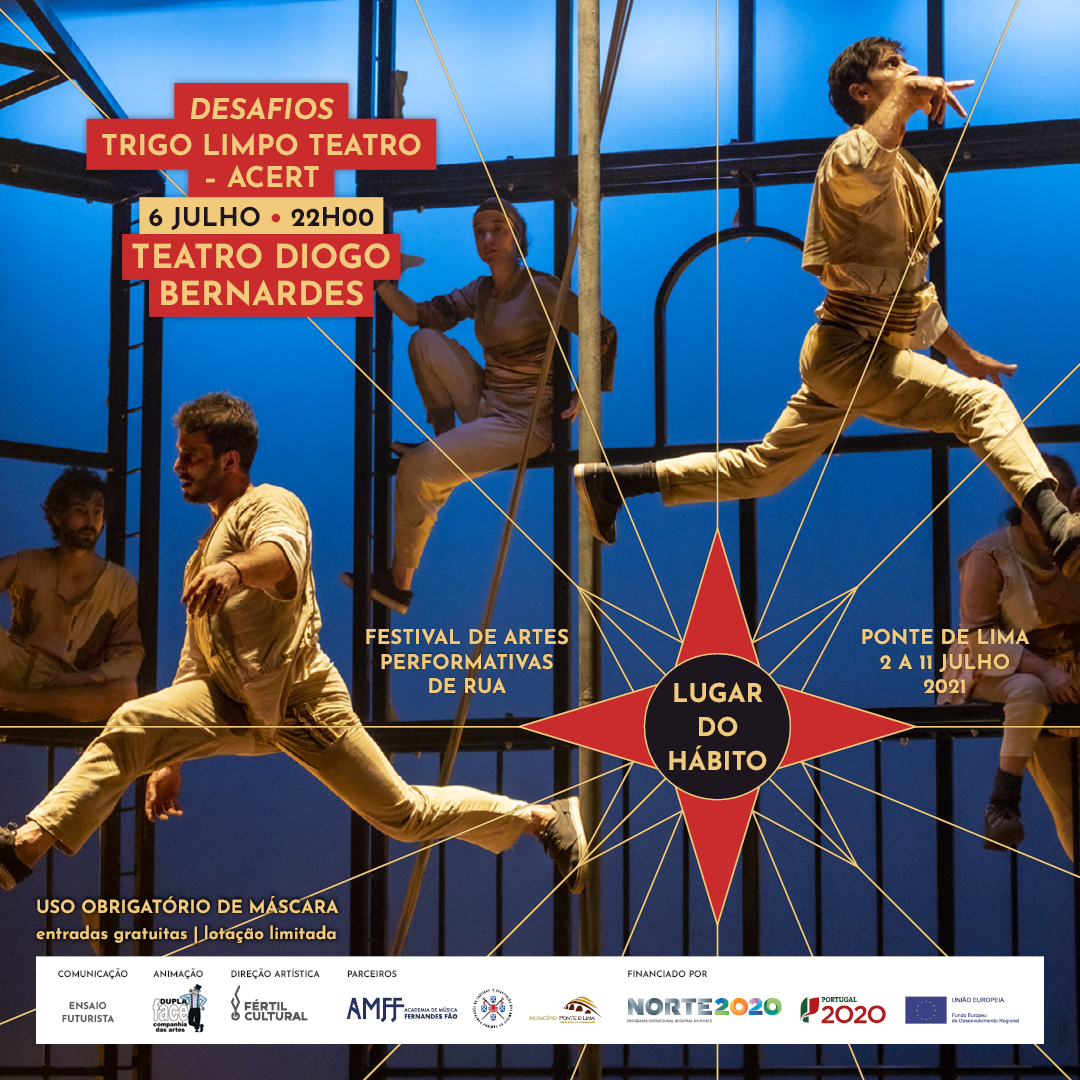 O espetáculo que estava programado, no âmbito do “Lugar do Hábito” – Festival de Artes Performativas de Rua, para o dia 6 de julho, terça, no Largo Fronteiro à Capela de S. João, pela Companhia Trigo Limpo Teatro – ACERT, denominado “Desafios”, irá ser transferido para o Teatro Diogo Bernardes, mantendo a mesma hora de apresentação, 22h00. Esta situação prende-se com a incerteza das condições climáticas que podem impedir a realização do espetáculo ao ar livre e a subsequente presença de público. Os bilhetes são gratuitos, mas obrigatórios, com lugares marcados, cumprindo o plano de contingência do TDB, pelo que devem ser levantados na bilheteira do mesmo, no período da manhã, entre as 9h30 e as 12h30 e no período da tarde, das 14h00 até às 17h30 e depois a partir das 20h30, uma hora e meia antes da realização do espetáculo.
