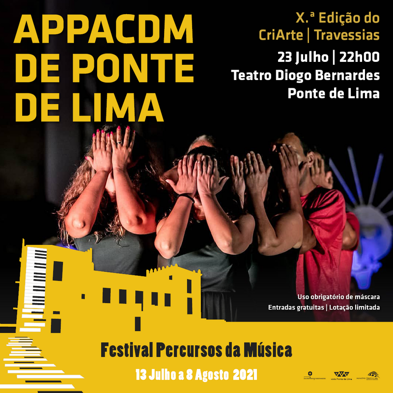 Dada a situação de incerteza das condições climáticas que podem impedir a realização do espetáculo ao ar livre e a subsequente presença de público na Expolima, a organização do “Festival Percursos da Música 2021”, decidiu transferir, para o Teatro Diogo Bernardes, a apresentação do espetáculo do dia 23 de julho, da APPACDM, Xª Edição CriArte - “Travessias”. O horário mantem-se às 22 horas.