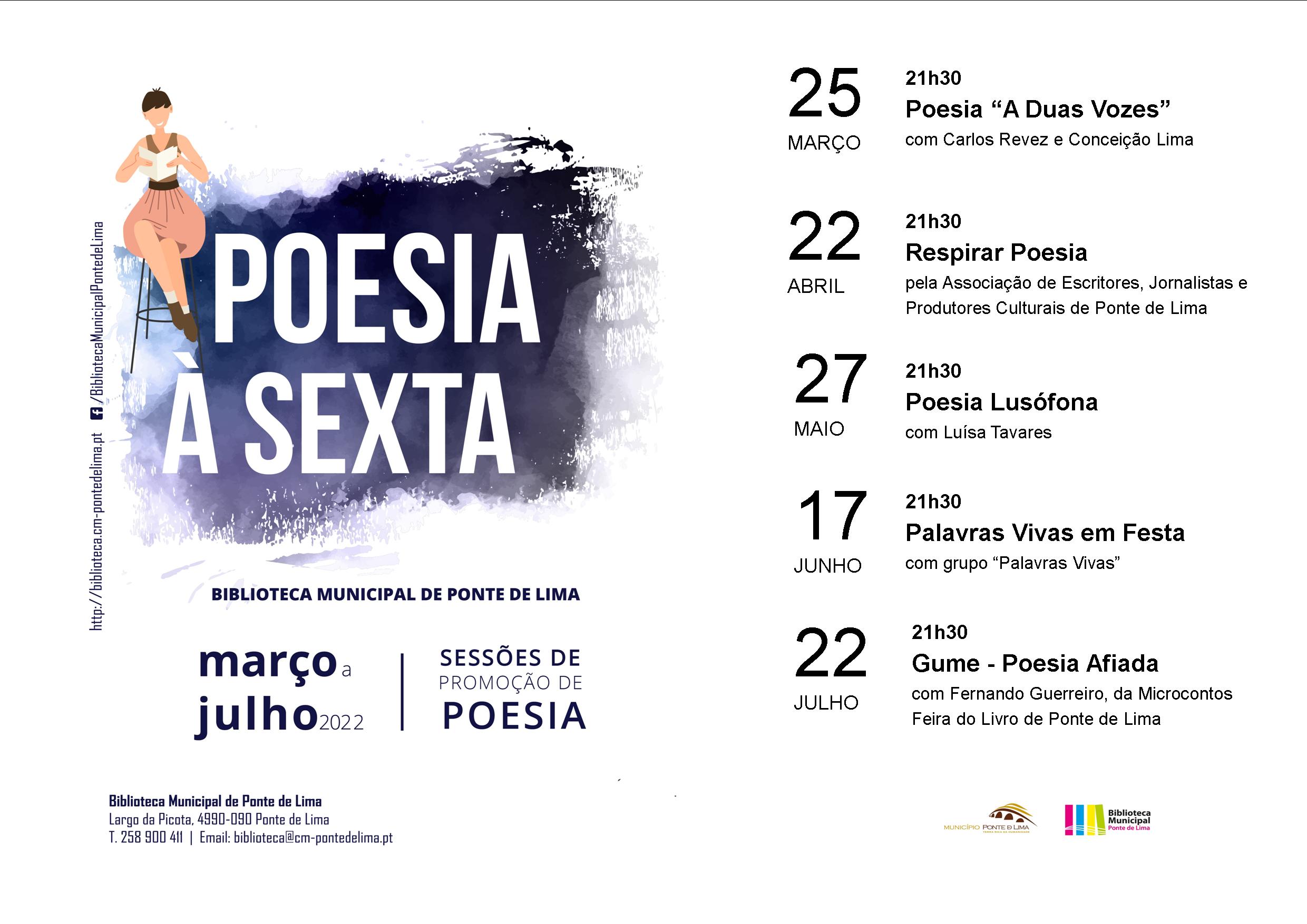 O Município de Ponte de Lima promove mais uma edição de “Poesia à Sexta”, com sessões a realizar de março a julho de 2022, às sextas-feiras, pelas 21h30, na Biblioteca Municipal.