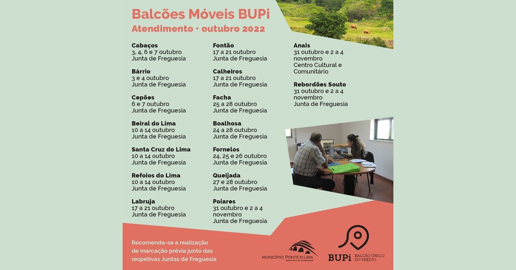 O Balcão Móvel BUPi irá deslocar-se às freguesias do concelho de Ponte de Lima, alternadamente, sendo oportunamente divulgada e publicada a sua calendarização para o próximo mês, estando esta sujeita a quaisquer alterações.