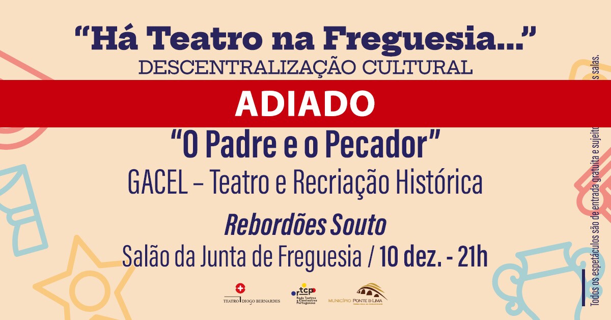 Lamentamos informar que, por motivos de força maior, o espetáculo O Padre e o Pecador, pela Gacel – Teatro e Recriação Histórica, integrado na iniciativa de descentralização cultural "Há Teatro na Freguesia...", que se iria realizar no Salão da Junta de Freguesia de Rebordões Souto, no próximo dia 10 de dezembro, pelas 21h00, foi adiado.