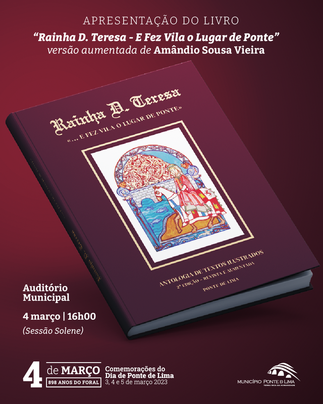 Integrada nas comemorações que assinalam o 4 de Março e na Sessão Solene a realizar no Auditório Municipal, vai ser apresentada ao público a segunda edição do livro Rainha D. Teresa «… E Fez Vila o Lugar de Ponte», da autoria do limianista Amândio de Sousa Vieira.