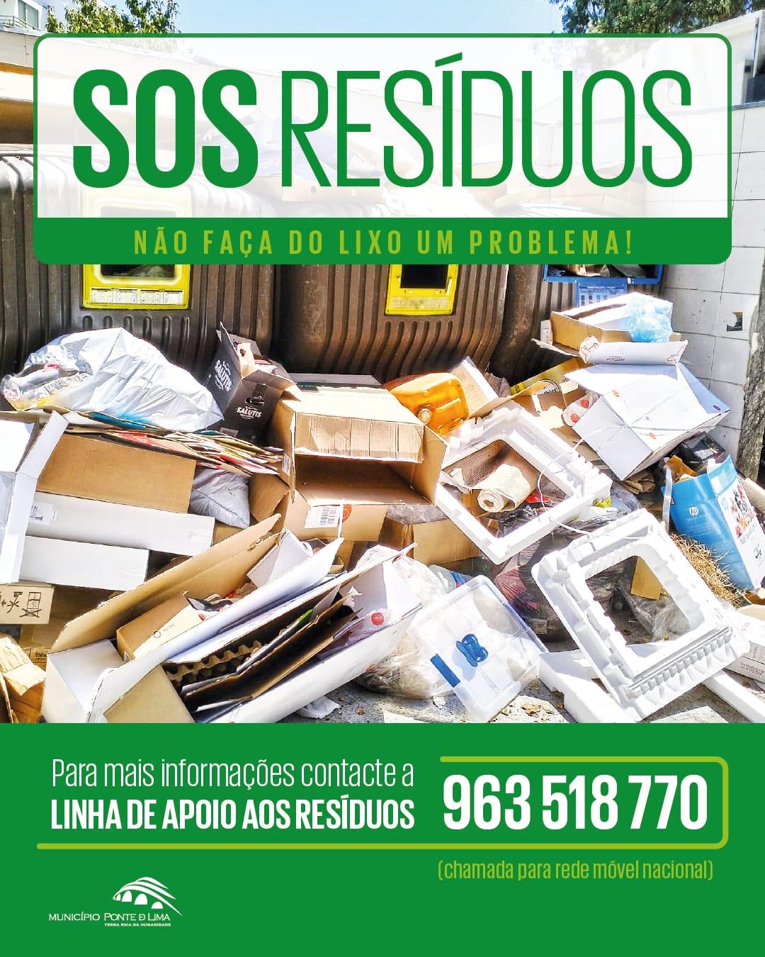 Não estando alheia a estas preocupações e, pelo contrário, dando ao assunto uma especial atenção, vem a Câmara Municipal de Ponte de Lima disponibilizar aos seus munícipes a Linha de Apoio aos Resíduos. Esta é uma linha verde que permitirá ao munícipe clarificar dúvidas no que diz respeito ao processo de Recolha de “Monos” (móveis, eletrodomésticos ou objetos de grande dimensão – Serviço ao domicílio, totalmente gratuito e de forma regular) assim como, esclarecer dúvidas na deposição de resíduos diferenciados (como Papel/Cartão, Plástico/Metal e Vidro), na deposição de óleos alimentares usados, roupas, entre outros resíduos.