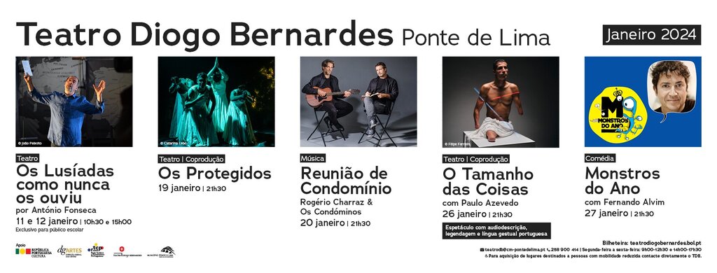 No ano em que se comemora o Vº Centenário do nascimento de Luís Vaz de Camões, o Teatro Diogo Bernardes dá as boas-vindas ao ano de 2024 com um espetáculo exclusivo para público escolar (turmas dos nonos anos dos Agrupamentos de Escolas do concelho de Ponte de Lima), "Os Lusíadas como nunca os ouviu", ditos por António Fonseca, pela Companhia Nacional de Espetáculos, com duas sessões diárias nos dias 11 e 12 de janeiro, pelas 10h30 e pelas 15h00.